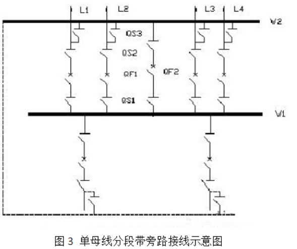單母線系統(tǒng)分段帶旁路接線:檢修出線斷路器,不致中斷該回路供電。見圖3。