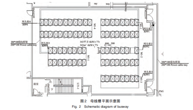 4 連接盒接線盒可以在母線系統(tǒng)主體上安裝,接線盒內(nèi)置控制空開及給機柜供電的插座。目前行業(yè)上,接線盒在母線系統(tǒng)主體上安裝,大多數(shù)均支持熱插拔方式,靈活卡位固定,方便隨時為擴容負載提供電氣連接。接線盒在母線系統(tǒng)主體上具體安裝位置行業(yè)上基本由兩種設(shè)計情況,固定安裝和靈活安裝,Sch?neider 等供應(yīng)商采用固定式位置安裝,即母線系統(tǒng)主體上每隔 600 mm 預(yù)留一個安裝孔位提供接線盒安裝。PDI、Startline等供應(yīng)商可在主體上任何位置安裝[6]。對不同尺寸規(guī)格機柜擺放而言,無疑后者更加適合機房的設(shè)計。 2. 5 監(jiān)控模塊監(jiān)控模塊分為末端及主控單元兩部分。末端單元為機房母線系統(tǒng)通過在端部饋電模塊、接線盒等部件配置智能化電量儀等電氣采集模塊,可即時采集功率、電流、電壓等電氣數(shù)據(jù)。主控單元包括硬件主控單元和軟件管理平臺。機房母線系統(tǒng)設(shè)計本文以某約 300 平米的電力機房為例,進行母線系統(tǒng)方案和傳統(tǒng)列頭柜方案設(shè)計比較。該區(qū)域可布置 9列機柜,每個列頭柜對就近兩列機柜供電,每個機柜尺寸為800 mm×1 100 mm。如圖2所示。