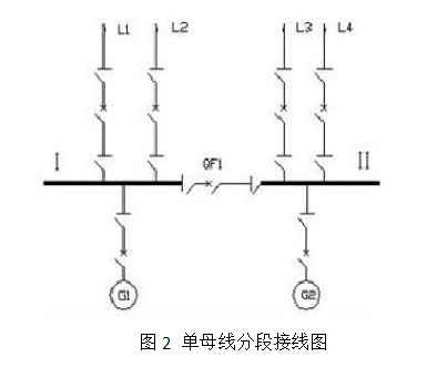 單母線系統(tǒng)接線優(yōu)點(diǎn):簡(jiǎn)單清晰、設(shè)備少、投資小、運(yùn)行操作方便,且有利于擴(kuò)建。缺點(diǎn):可靠性和靈活性較差。應(yīng)用:6~10kV配電裝置的出線回路數(shù)不超過5回;35~63kV配電裝置的出線回路數(shù)不超過3回;110~220kV配電裝置的出線回路數(shù)不超過2回。改進(jìn):單母線系統(tǒng)分段接線、單母線系統(tǒng)帶旁路接線。(2)單母線系統(tǒng)分段接線:避免單母線系統(tǒng)接線可能造成全廠停電的缺點(diǎn),提高供電可靠性及靈活性。見圖2。